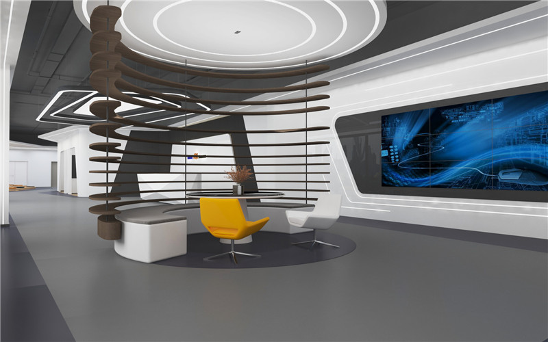4)比較不常見的吊頂設計方式叫光棚式天花。光棚式天花是天花在某部分或全部用木或金屬作圖案框架,在架上放置透光片,在棚架上排布日光燈,燈光通過燈片的散射形成整個棚通亮,如同天窗透光的天花造型,通過透光的效果,產生較高的心理空間,給人以高于實際尺度的空間感,但同時造價也較高,不夠節能,所以這類設計方式在實際辦公樓裝修運用中并不常見。
