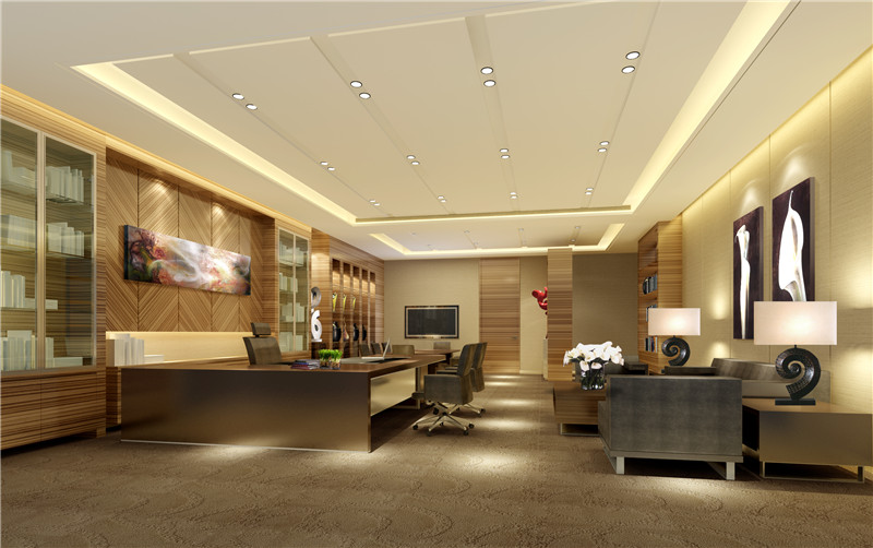 1)辦公樓吊頂的造型可以非常獨特,有創意。由幾個圓環形組成,非常的大氣,象征著公司業務的完美開展。朱紅色的辦公桌和白色的吊頂搭配非常的和諧,給人一種非常沉穩、大氣的感覺。
