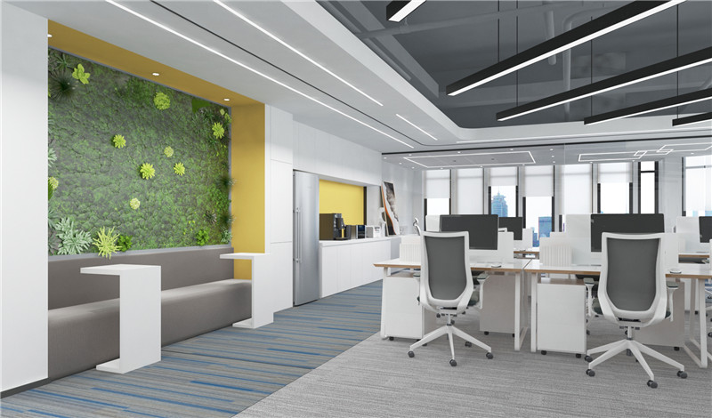 對于一些面積較小的辦公室來看,有些時候不方便擺放實物的隔斷,而可以通過吊頂的設計對空間進行“視覺”上的分割,讓辦公室空間看起來更有層次感。