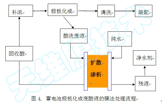 極板化成之后的廢酸由于酸洗極板之后廢酸中鐵離子含量增加。如果重復使用由于鐵離子的存在會與負電極形成腐蝕微電池,引起負極金屬溶解;電解液廢酸中鐵離子含量高則引起電池的自放電使電池容量減少,降低電池使用壽命。用擴散滲析法回收處理電解液廢酸和化成廢酸,鐵離子截留率在90%以上。